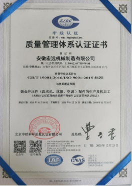 ? 安徽宏遠機械制造有限公司(原合肥徐恒工貿有限公司),創建于2003年12月,現座落于肥西縣桃花鎮長安工業聚集區楊井路15號。目前公司占地面積30余畝,生產廠房兩棟,總建筑面積12000平米,綜合辦公樓一棟,建筑面積3000平米,公司2019年年產值2.45億元。我公司是以鈑金沖壓、加工為主的生產企業,擁有完整的精加工檢驗體系。通過近年的發展,公司已由原先單一的沖壓加工生產模式,轉化為模塊化、多業務鏈的汽車、家電零部件的制造企業,目前公司產品品種已涉及家電,汽車零配件近百種。 公司擁有大、中、小型沖壓及焊接機械設備近100余臺套,其中630T-1200T大臺面架框液壓機(移動工作框臺面)5臺,氣動100T-250T沖床20余臺,63T壓力沖床10臺,25T-40T壓力沖床20余臺,315T液壓機4臺,300T液壓機4臺,日本松下350-500電焊機20臺,電焊機、二氧化碳氣體保護焊機、氬弧焊機合計10臺,大小自動手動剪板機5臺,維護設備車床、銑床、刨床、磨床、搖臂轉床等11臺,引進進口機械手臂,實現全自動線生產,引進空調面板全自動生產線和噴涂生產線可供大中型企業鈑金制品零部件配套產品的加工。 公司現有員工245余人,高級技術人員30人,高級管理人員15人,擁有精密的加工設備、科學的管理模式和優秀的企業文化。高素質的員工隊伍、精良的加工和檢測設備,為公司產品提供可靠基礎,2019年產值為24500萬元,預計2020年產值26000萬元。本公司的主要上游客戶為合肥美的暖通有限公司、惠而浦(中國)電器有限公司、tcl家用電器有限公司、重慶美的有限公司、海爾電器(章丘)有限公司等,我司和上游客戶達成了常年的合作關系,并先后被評為上游客戶的優質供應商。我司一直秉承誠信第一、以質取勝為宗旨。真誠的歡迎各界客戶與宏遠共同發展興旺。