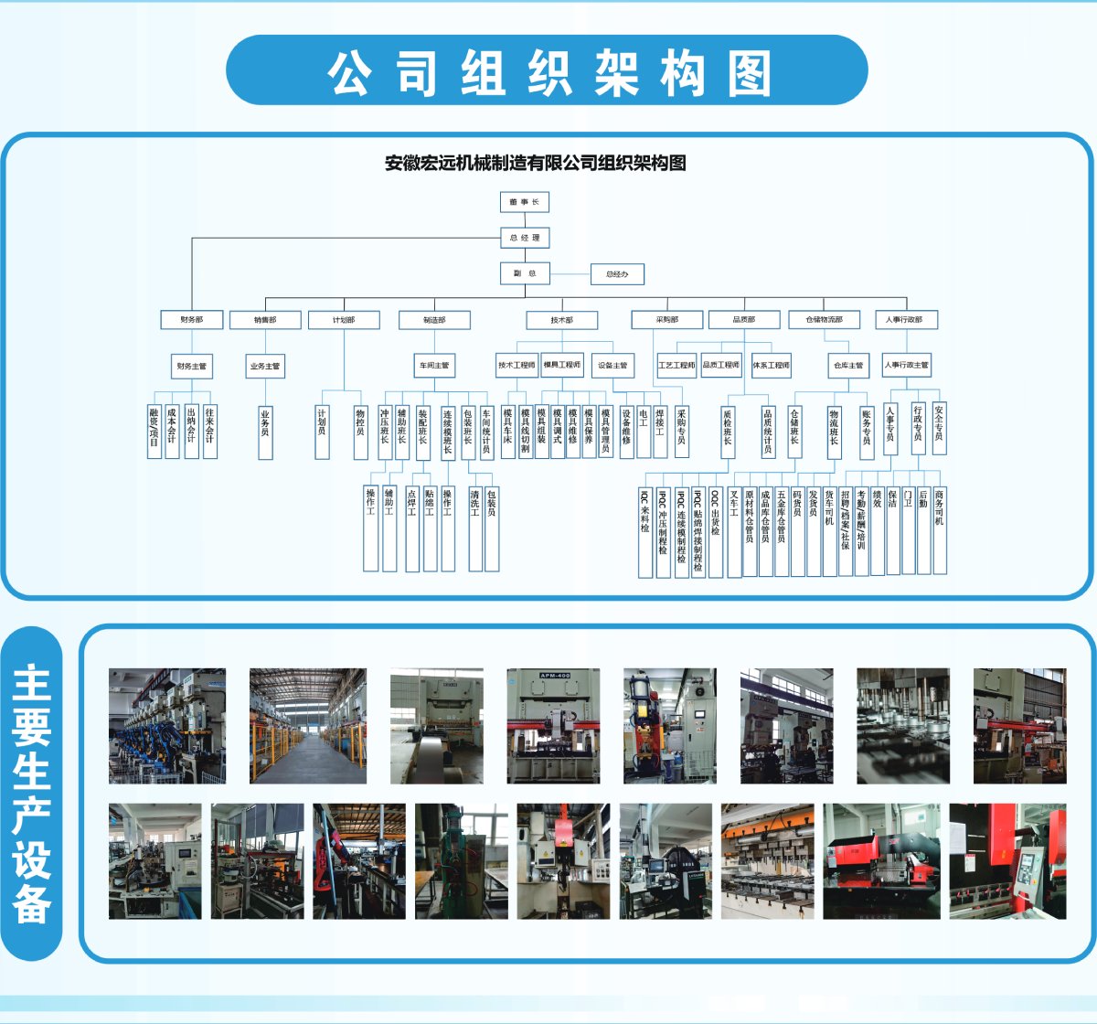公司擁有大、中、小型沖壓及焊接機(jī)械設(shè)備近100余臺(tái)套,其中630T-1200T大臺(tái)面架框液壓機(jī)(移動(dòng)工作框臺(tái)面)5臺(tái),氣動(dòng)100T-250T沖床20余臺(tái),63T壓力沖床10臺(tái),25T-40T壓力沖床20余臺(tái),315T液壓機(jī)4臺(tái),300T液壓機(jī)4臺(tái),日本松下350-500電焊機(jī)20臺(tái),電焊機(jī)、二氧化碳?xì)怏w保護(hù)焊機(jī)、氬弧焊機(jī)合計(jì)10臺(tái),大小自動(dòng)手動(dòng)剪板機(jī)5臺(tái),維護(hù)設(shè)備車床、銑床、刨床、磨床、搖臂轉(zhuǎn)床等11臺(tái),引進(jìn)進(jìn)口機(jī)械手臂,實(shí)現(xiàn)全自動(dòng)線生產(chǎn),引進(jìn)空調(diào)面板全自動(dòng)生產(chǎn)線和噴涂生產(chǎn)線可供大中型企業(yè)鈑金制品零部件配套產(chǎn)品的加工。